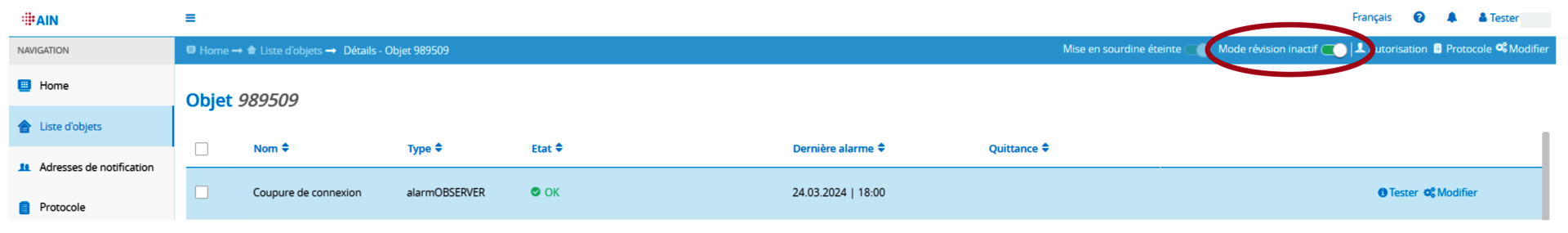 La fonction « Mode révision » se trouve dans la barre bleue en haut à droite de l’application TUS-AIN Web App. Pour y accéder, l’objet doit être sélectionné via « Détails » ou « Modifier » (uniquement pour les utilisateurs disposant du rôle Administrateur). Pour activer le mode révision, procédez comme suit :
