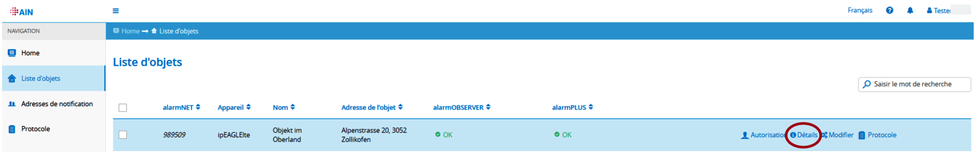 5. Dans la liste des objets, affichez les détails de l'objet concerné.