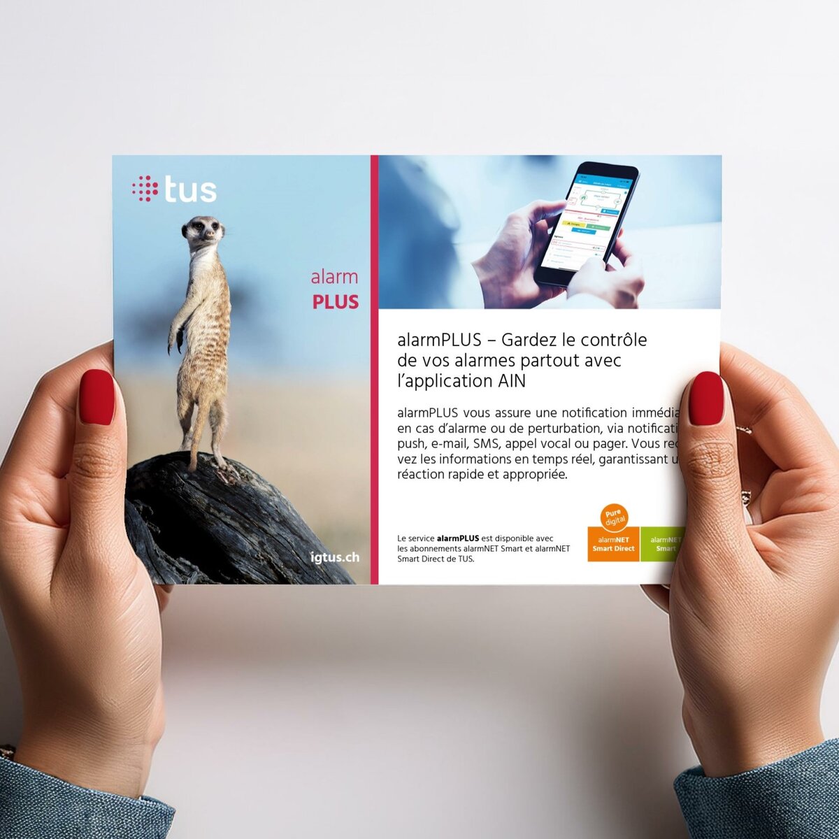 Les nouveaux dépliants produits de TUS sont conçus au format paysage, adapté aux écrans d'ordi-nateur, et contiennent toutes les informations essentielles sur les services sélectionnés. Les images des produits et les graphiques sont désormais identiques à ceux du site web, facilitant ainsi l'orienta-tion entre les différents supports. Pour les services supplémentaires tels qu'alarmPLUS, une nouvelle indication d'abonnement est présente en première page du dépliant, précisant la compatibilité du service. Ainsi, il est immédiatement clair quel abonnement alarmNET est compatible avec quels ser-vices supplémentaires.