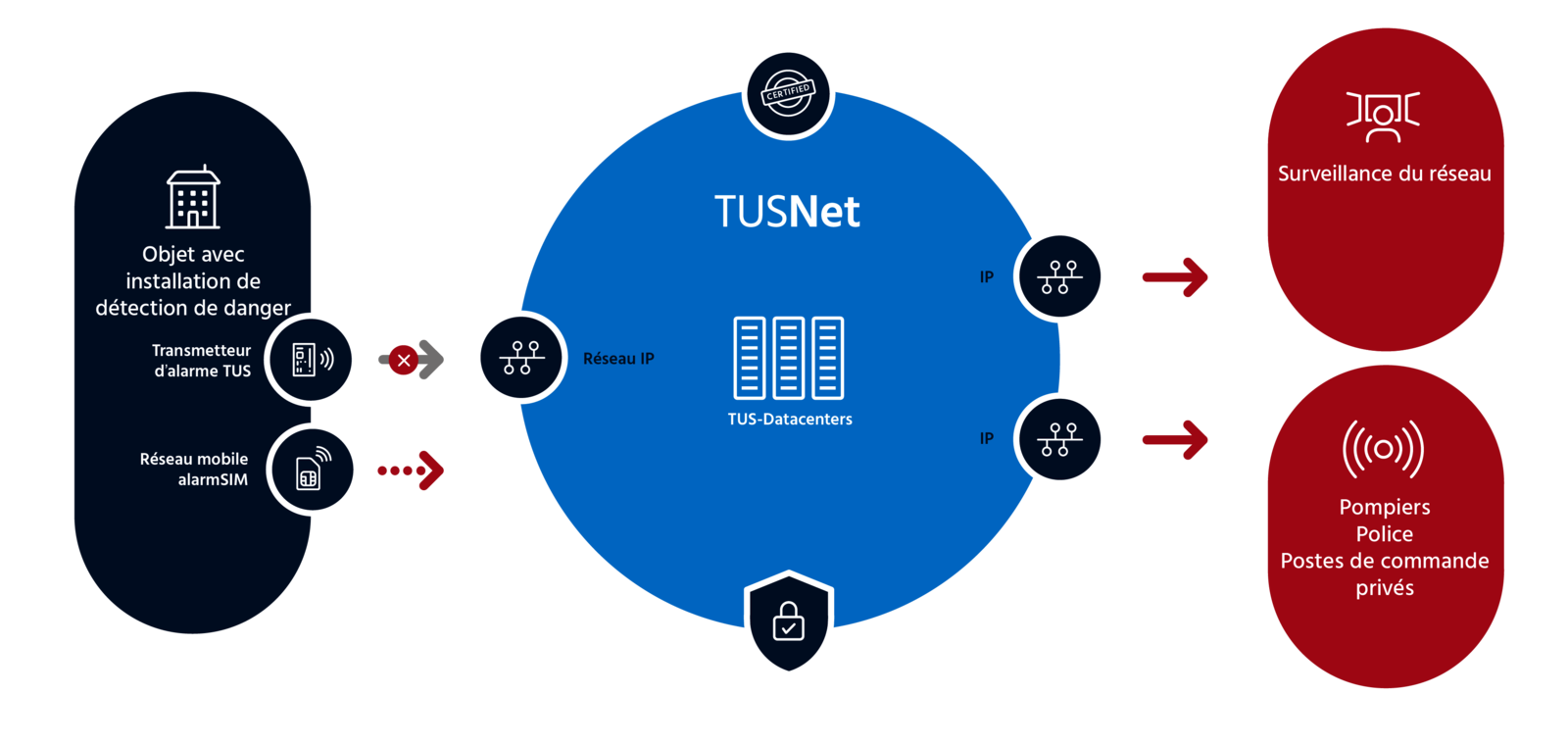 TUS exploite ses propres centres de calcul certifiés et hautement sécurisés en Suisse. Notre plateforme de transmission n'est pas connectée aux centrales d'alarme via Internet, mais, au lieu de cela, via des connexions tunnelisées dédiées et gérées (VPN). Grâce à des tests d’intrusion réguliers effectués par des spécialistes externes, nous réduisons les risques de cyber-attaques sur nos services.