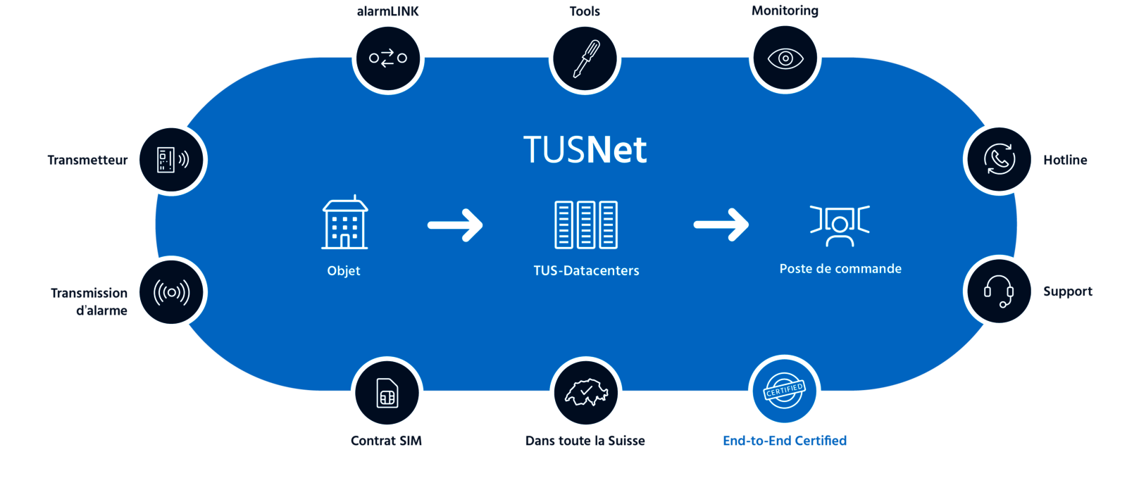 - Sécurité maximale : les alarmes sont transmises via le réseau TUSNet, hautement sécurisé