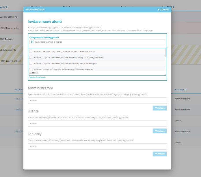 Qualora gli indirizzi di notifica del suo oggetto non fossero ancora completi, ha la possibilità di invitare altre persone. Un nuovo indirizzo di notifica invitato tramite la piattaforma riceve un'e-mail con un link di invito la registrazione.