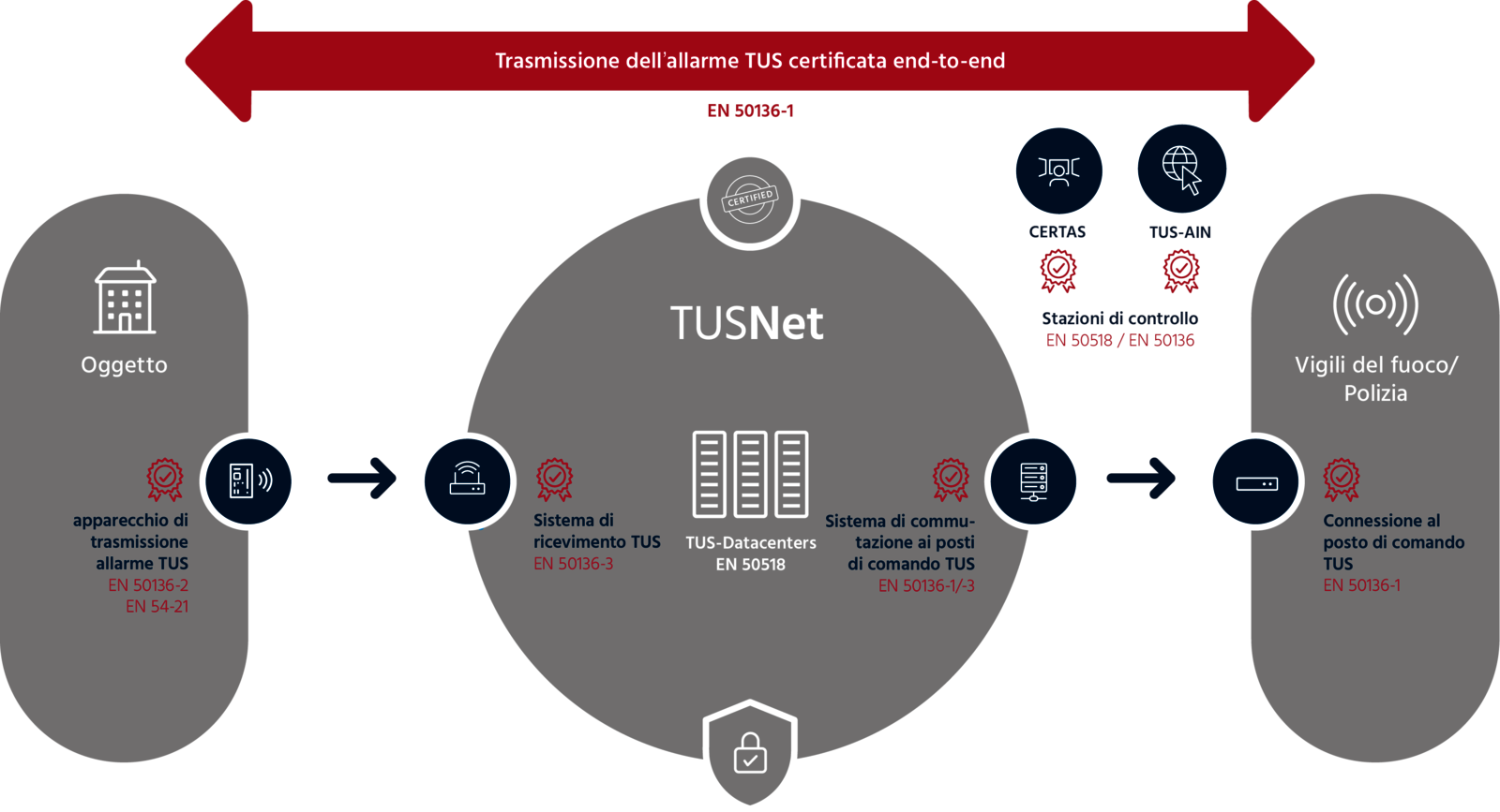 TUS ha fatto certificare tutti i sistemi e processi dei propri servizi di trasmissione d’allarme alarmNET secondo ogni norma rilevante – e questo come unico offerente in Svizzera. Clienti, installatori, posti di comando e assicurazioni degli immobili approfittano di una sicurezza completa. L'ultima ricertificazione riuscita ha avuto luogo nella primavera del 2024.