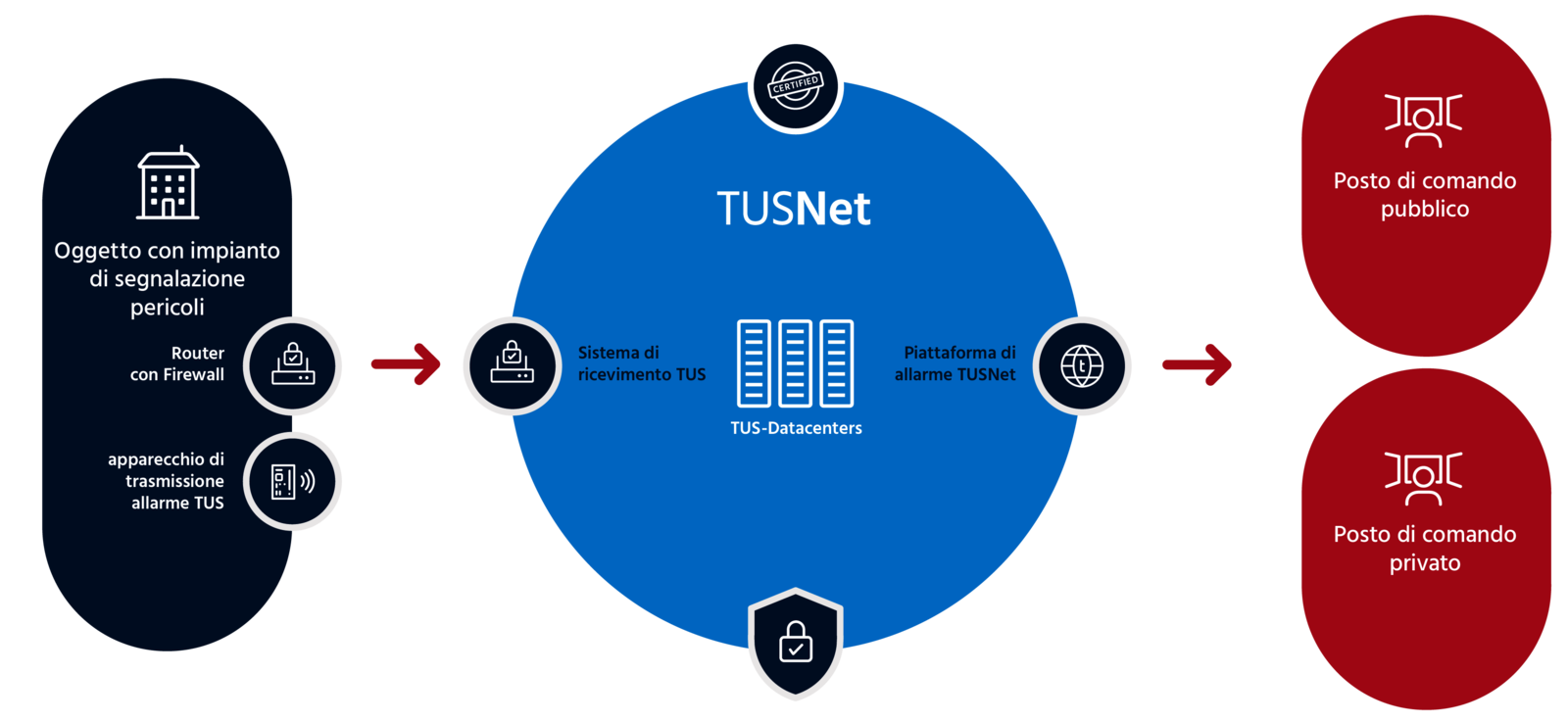 TUS gestisce centri di calcolo proprietari, altamente sicuri e certificati, che si trovano in Svizzera. La nostra piattaforma di trasmissione non è collegata alle centrali di allarme tramite Internet, bensì attraverso un apposito tunnel sicuro con una connessione dedicata e gestita separatamente (VPN). Regolari test di penetrazione eseguiti da specialisti esterni ci consentono di ridurre il rischio di attacchi informatici ai nostri servizi.