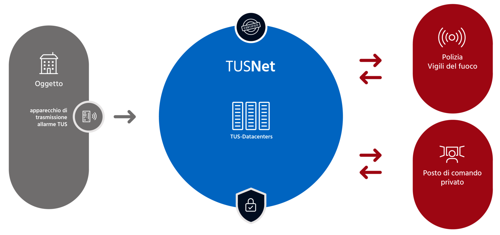 TUS gestisce centri di calcolo proprietari, altamente sicuri e certificati, che si trovano in Svizzera. La nostra piattaforma di trasmissione non è collegata alle centrali di allarme tramite Internet, bensì attraverso un apposito «tunnel» sicuro con una connessione dedicata e gestita separatamente (VPN). Regolari test di penetrazione eseguiti da specialisti esterni ci consentono di ridurre il rischio di attacchi informatici ai nostri servizi.