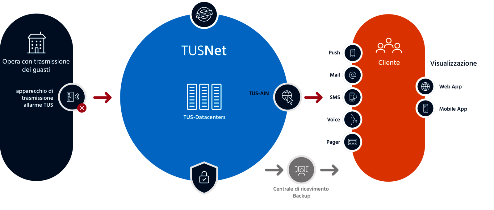 alarmOBSERVER è attivo sulla piattaforma di notifica AIN (Automatic Intelligent Notification). La piattaforma AIN funziona parallelamente rispetto alla consolidata piattaforma TUSNet ed è collegata ad essa in modo ridondante. La piattaforma AIN consente di adattare le procedure di allarme alle esigenze specifiche in modo facile e sicuro. Come tutti i servizi di TUS, anche questo strumento è certificato end-to-end.