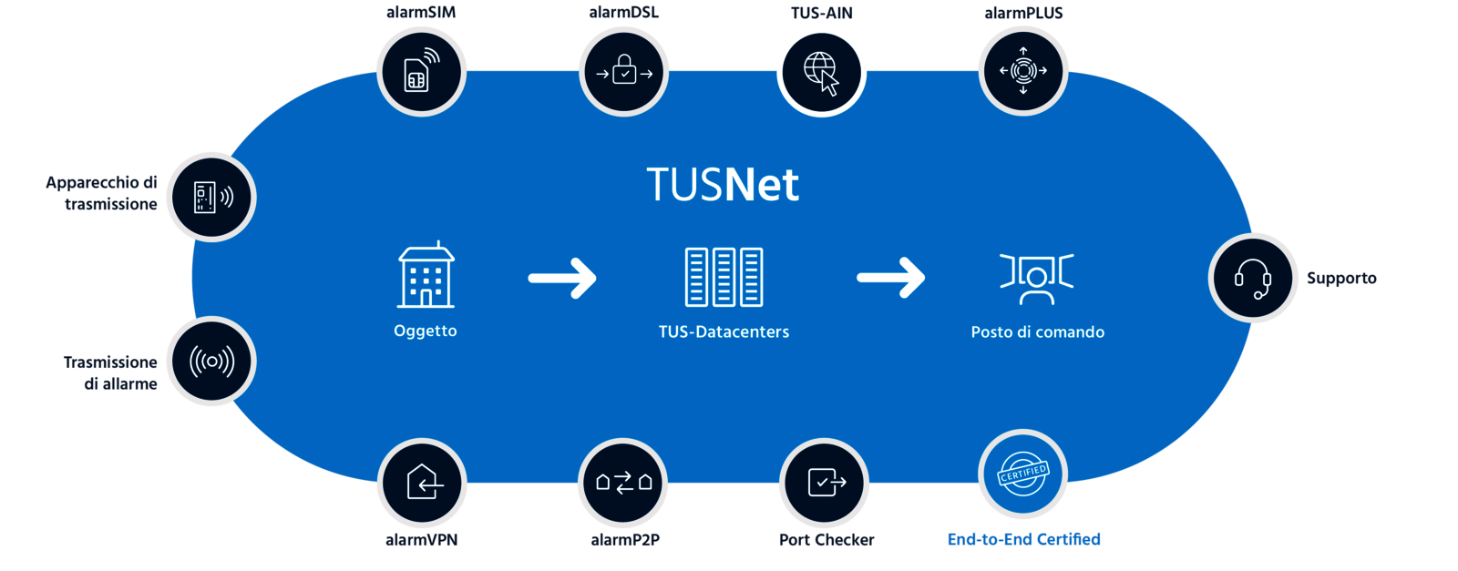 Nella vostra azienda non avete intenzione di lasciare al caso ciò che riguarda gli allarmi? TUS offre, come unico fornitore in Svizzera, servizi di trasmissione di allarme con sistemi e processi interamente certificati end-to-end e capillari. Grazie agli innovativi servizi aggiuntivi e alla consulenza personale, troverete la soluzione perfetta per voi.