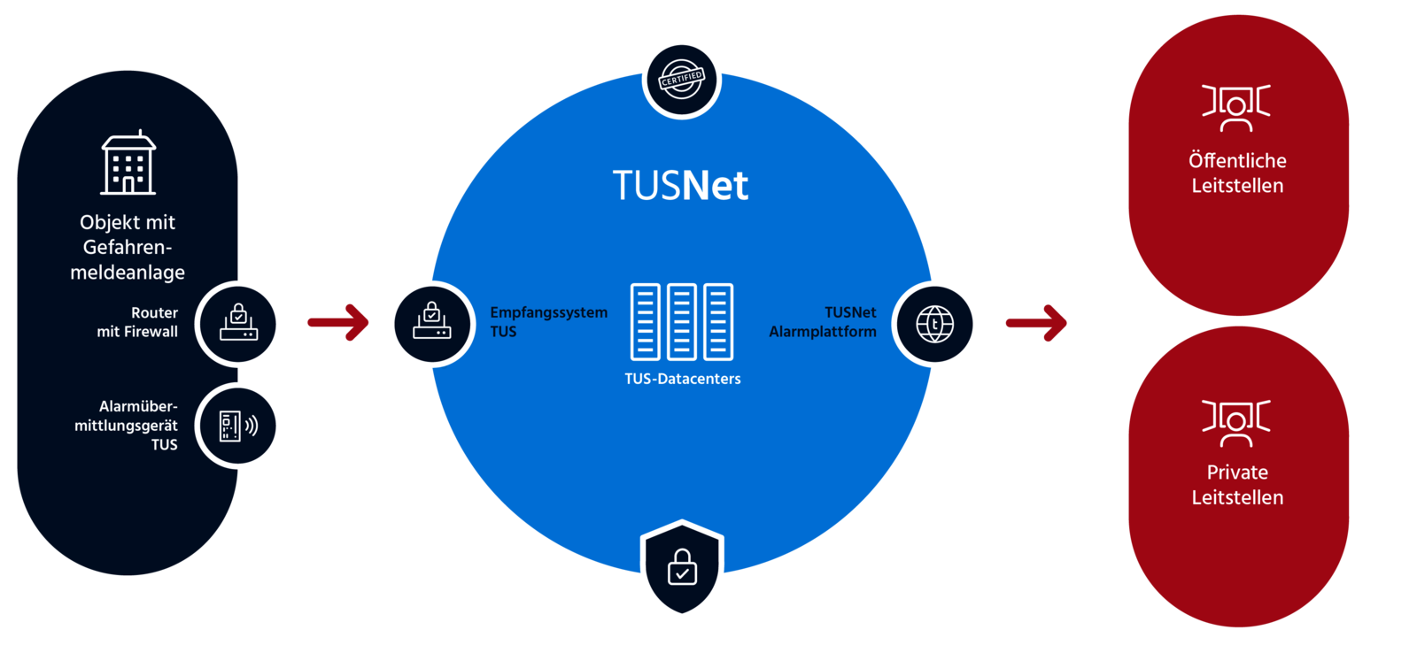 TUS betreibt eigene hochsichere, zertifizierte Rechenzentren in der Schweiz. Unsere Übertragungsplattform ist nicht etwa über das Internet an die Alarmzentralen angebunden. Sondern sicher im eigenen «Tunnel» über eine gemanagte dedizierte Verbindung (VPN). Mit regelmässigen Penetrationstests durch externe Spezialisten verringern wir die Risken von Cyberangriffen auf unsere Services.
