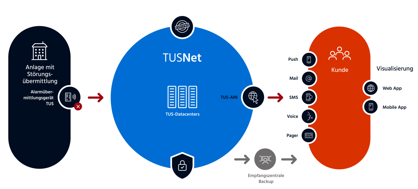 Der alarmOBSERVER ist auf der Notifikationsplattform AIN (Automatic Intelligent Notification) aufgeschaltet. AIN wird parallel zur bewährten TUSNet-Plattform betrieben und ist mit dieser redundant verbunden. Die AIN-Plattform ermöglicht es, dass Sie die Alarmabläufe auf einfache und sichere Weise präzise an Ihre Bedürfnisse anpassen können. Wie alle anderen Services von TUS ist sie End-to-end-zertifiziert.