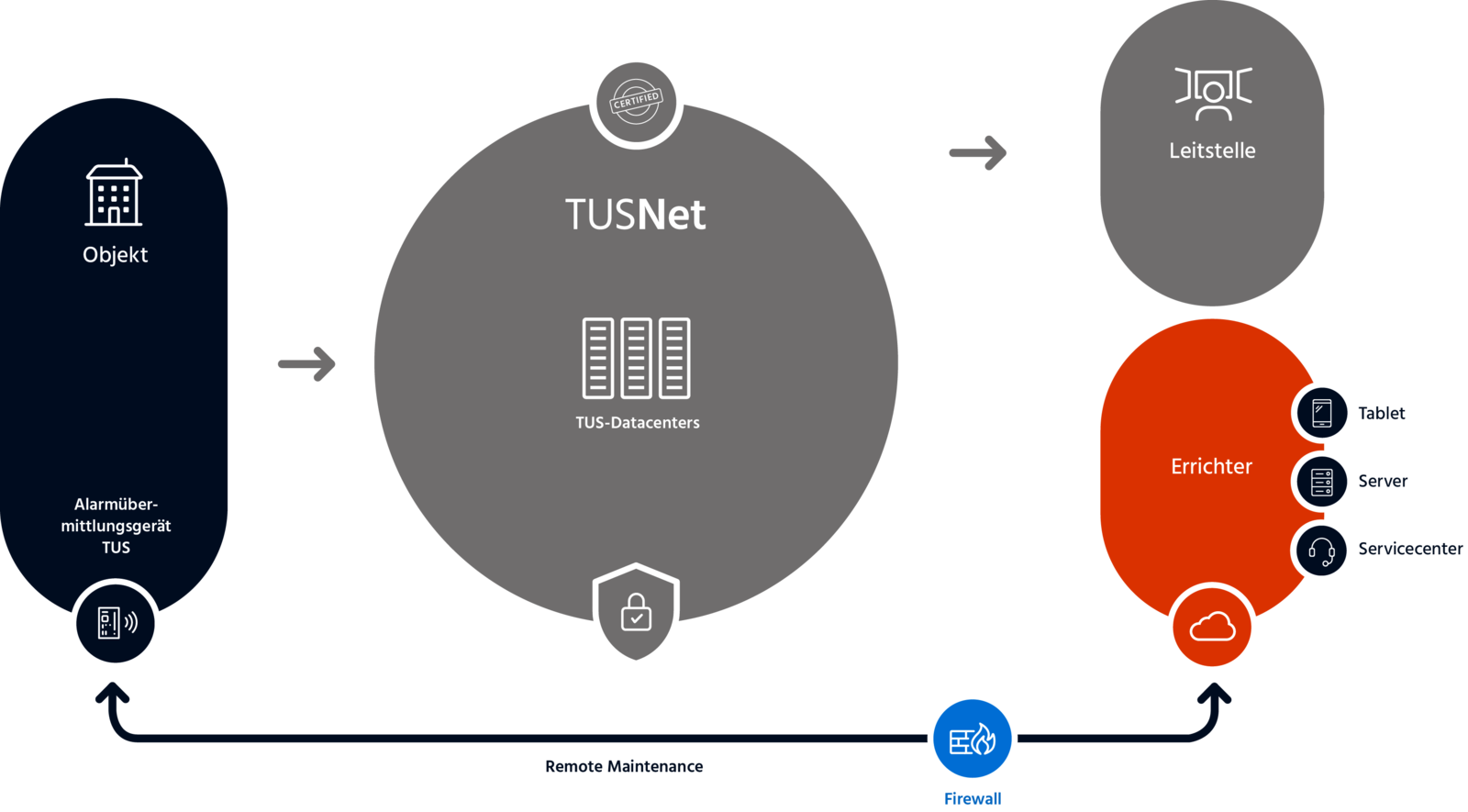TUS erhielt das RARS-Zertifikat (Remote Access for Remote Services, RARS) für alarmVPN, eine sichere Virtual Private Network (VPN)-Lösung, die im Standard-Alarmübertragungsgerät von TUS integriert ist. Errichter können z. B. auf Ihre Gefahrenmeldeanlage oder andere Systeme zur Fernunterstützung zugreifen oder Betriebsdaten an einen Server übertragen und haben so jederzeit Zugriff auf nützliche Anlagendaten. Es ist ein großer Vorteil, wenn der Fernzugriff über das Standard-Alarmübermittlungsgerät erfolgen kann, da dieses in der Regel bereits beim Kunden für die Alarmanlage installiert ist.