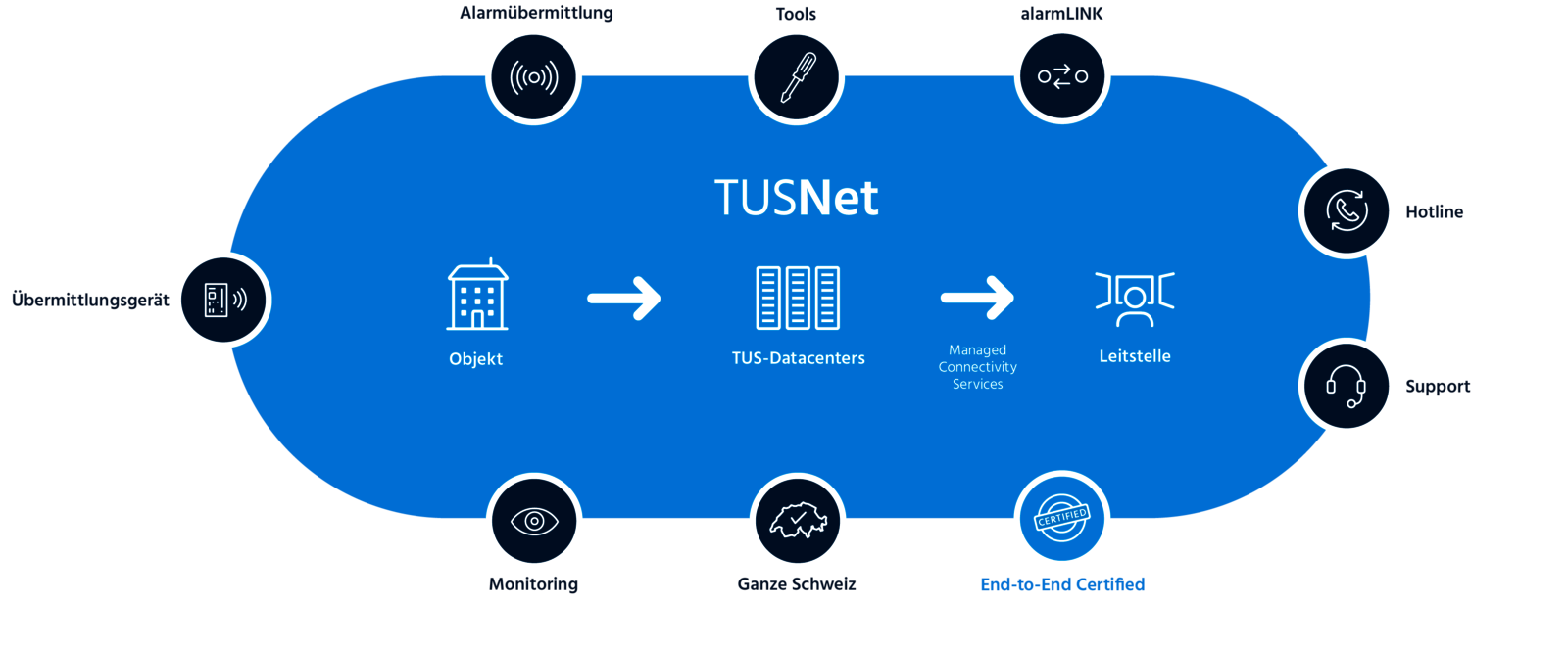 Seit 1968 setzt TUS den Standard für die sichere Alarmübertragung in der Schweiz. Wir bieten Endkunden, öffentlichen und privaten Alarmzentralen sowie Anlagenerrichtern intelligente und hochsichere Services.