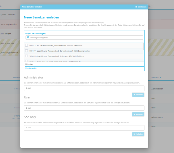 >> Loggen Sie sich in der TUS-AIN WebApp ein, selektieren Sie Ihr Objekt in der Objektliste und klicken Sie unterhalb der Meldeadressen auf den Button «Hinzufügen». Es öffnet sich das Fenster «Neue Benutzer einladen».